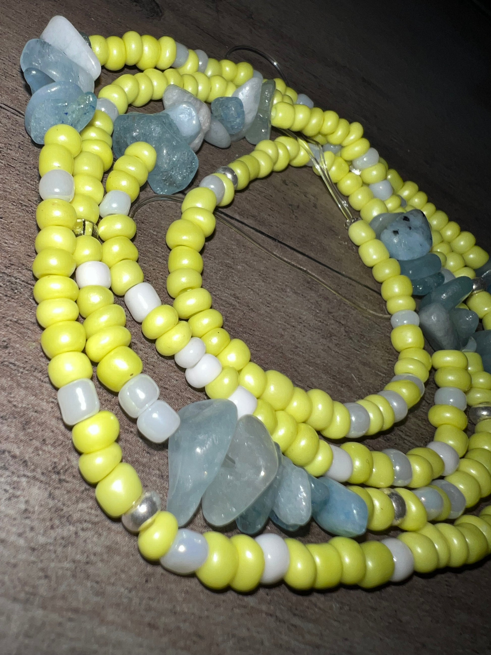 Elevate your energy and embrace your inner goddess with these handcrafted waist beads, designed with a vibrant blend of sunny yellow seed beads and genuine aquamarine chips. The cheerful yellow symbolizes joy and confidence, while aquamarine, known for its calming and healing properties, brings serenity and balance.
