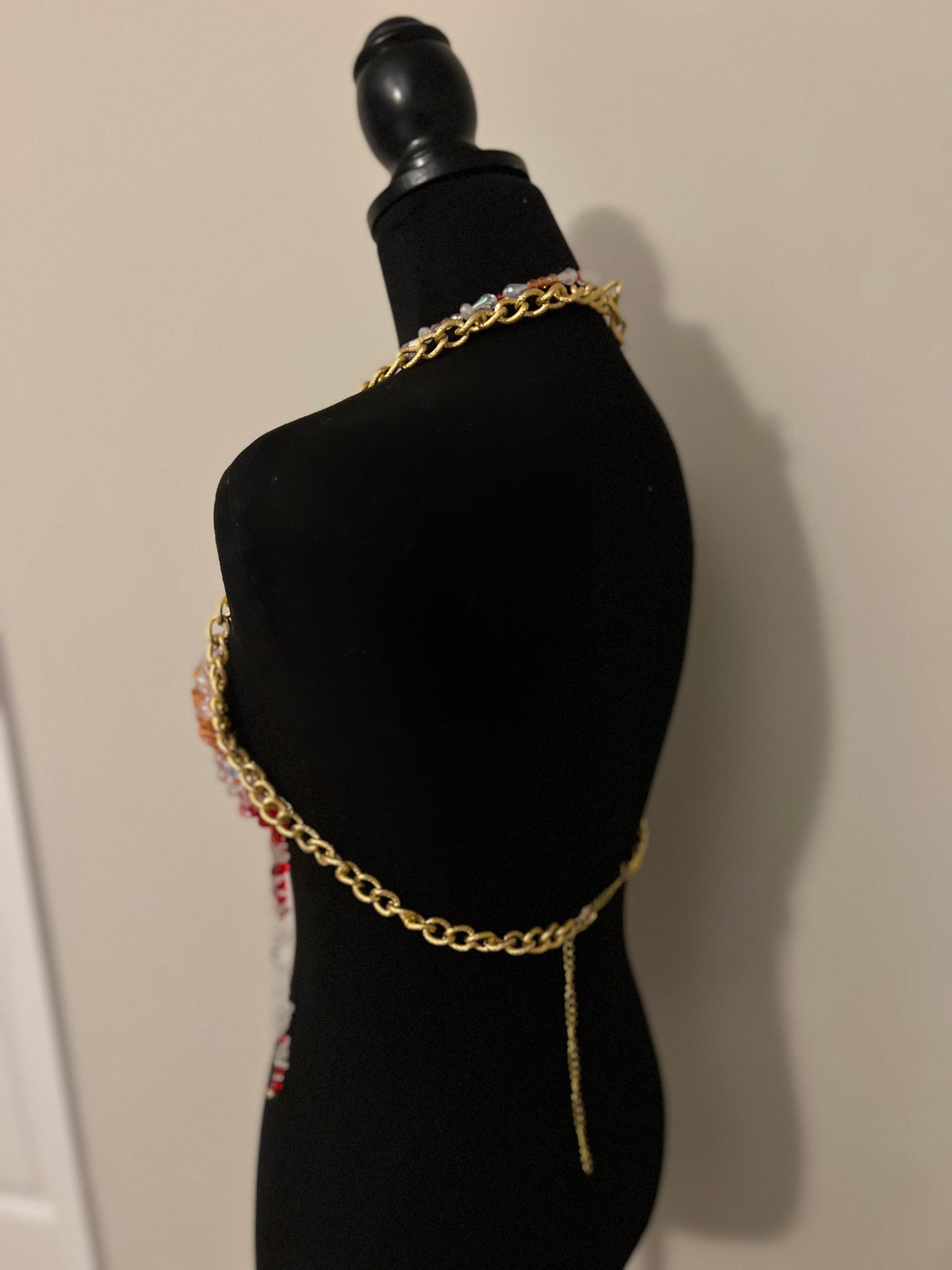 Make a bold statement with this stunning handmade beaded bralette, designed with intricate beadwork in warm sunset tones of red, orange, and beige. Inspired by the elegance of butterfly wings, this piece features delicate draping beads, clear quartz accents, and shimmering details that catch the light beautifully. Adjustable gold chain straps ensure a comfortable and stylish fit. Perfect for festivals, raves, beachwear, or as a unique layering piece for a boho-chic look.