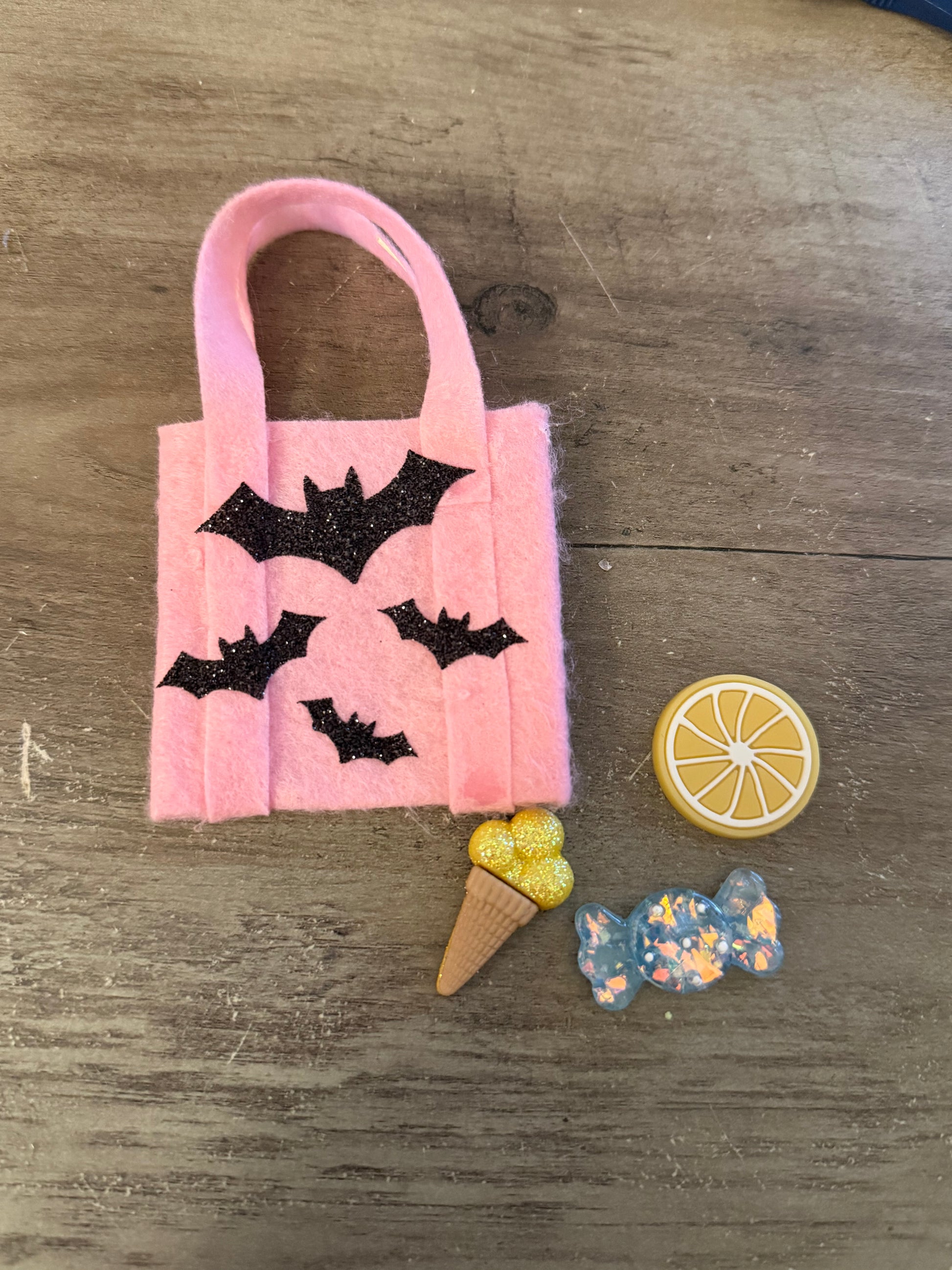 Add a spooky-cute touch to your Doll collection with these handmade Halloween tote bags! Featuring glittery flying bats 🦇 , each bag is perfectly sized to hold miniature treasures, accessories, or tiny treats.