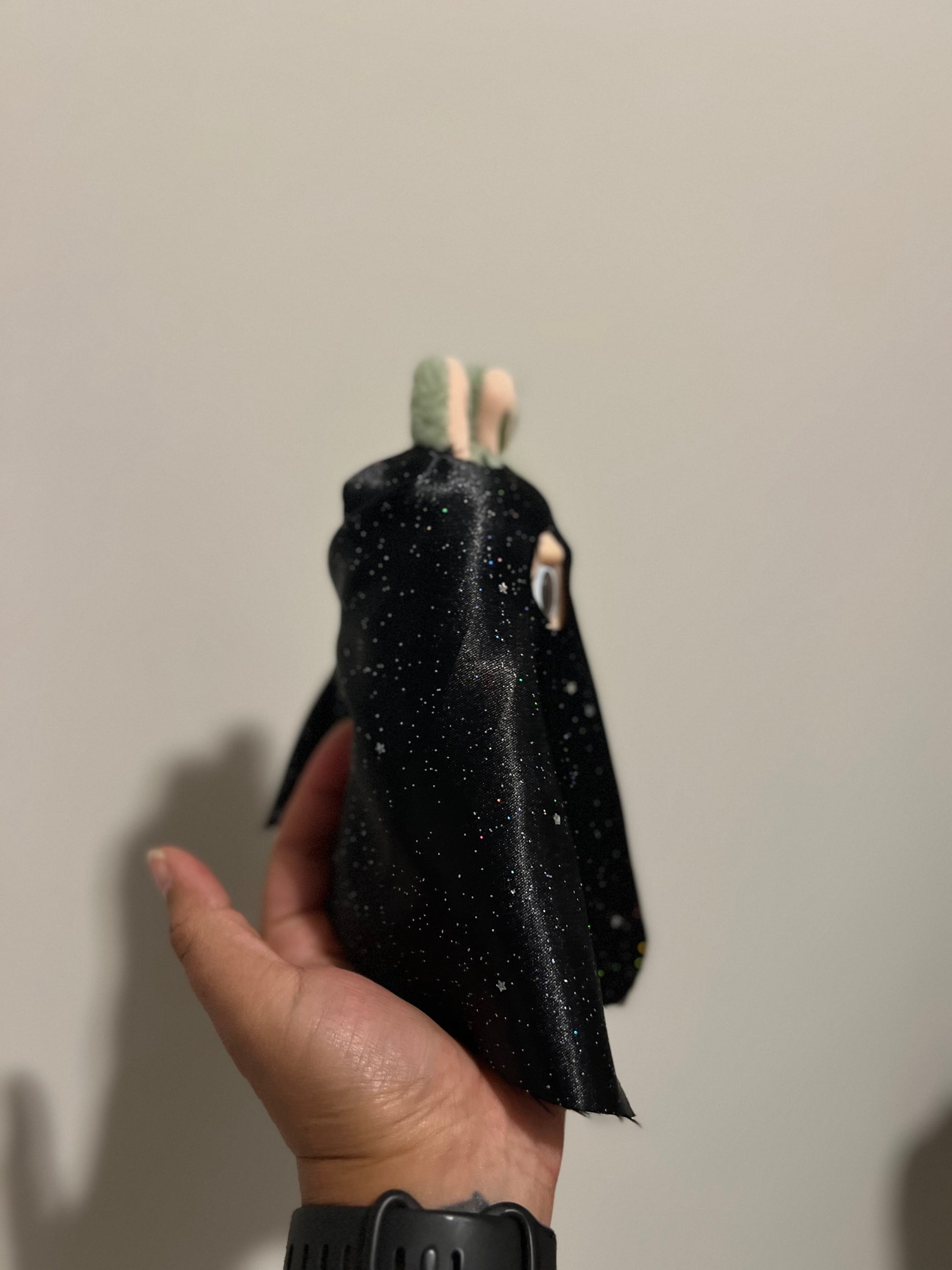 Dress your Bubu in celestial style with this one-of-a-kind handmade costume! Crafted from luxurious black satin fabric sprinkled with shimmering glitter and tiny stars, each piece is individually made by hand—meaning no two costumes will ever be exactly alike. The soft satin drapes beautifully, while the sparkling details give your Doll a magical, night-sky look perfect for display or photos. Truly unique, just like your Bubu!