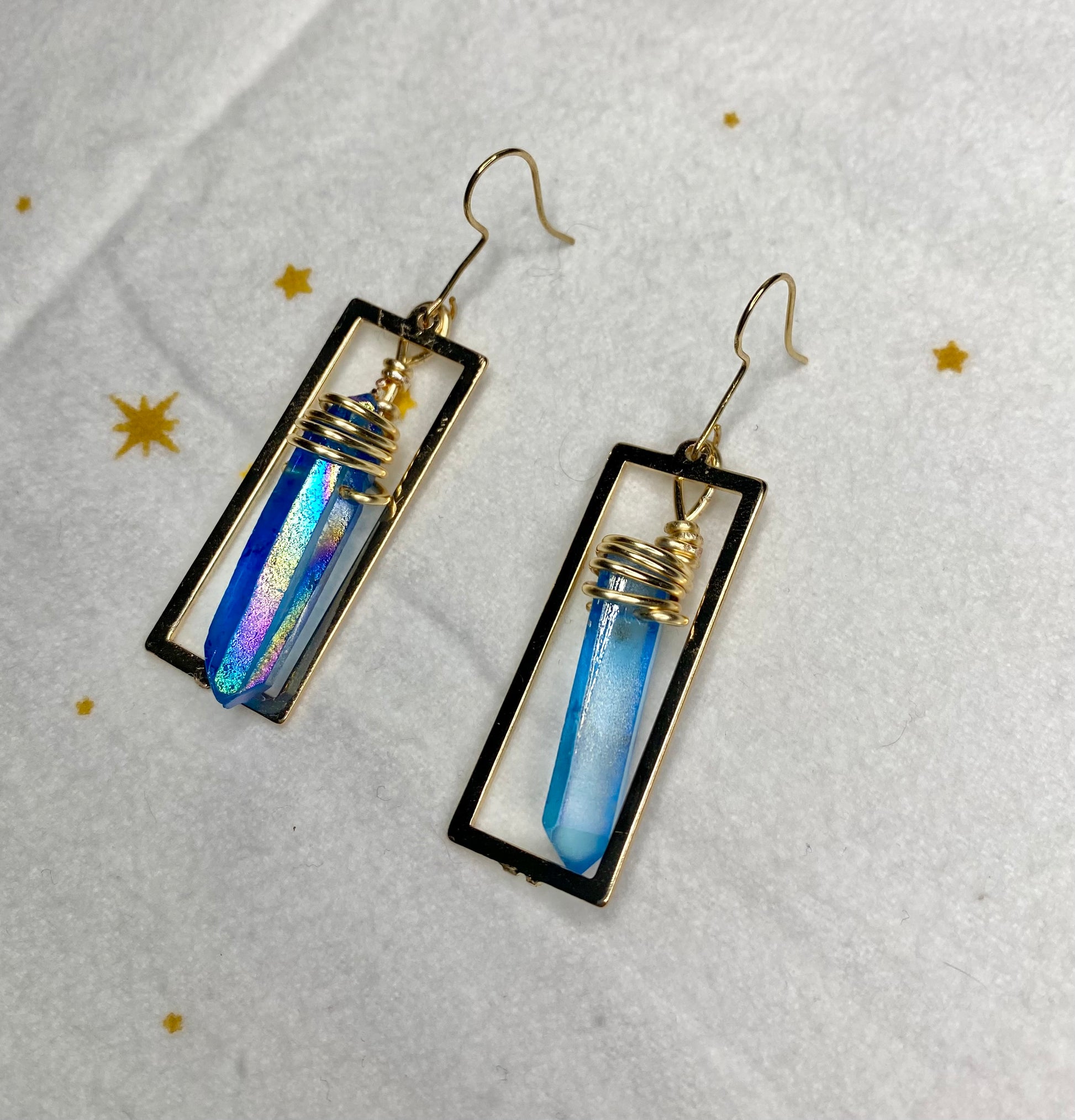 The necklace and earrings are made with a stainless steel 18k gold plating solution as well as the wire used to wrap the quartz. The earrings have a drop length of 2.5 inches and a width of 1 inch. Both the necklace and earrings are super lightweight <3