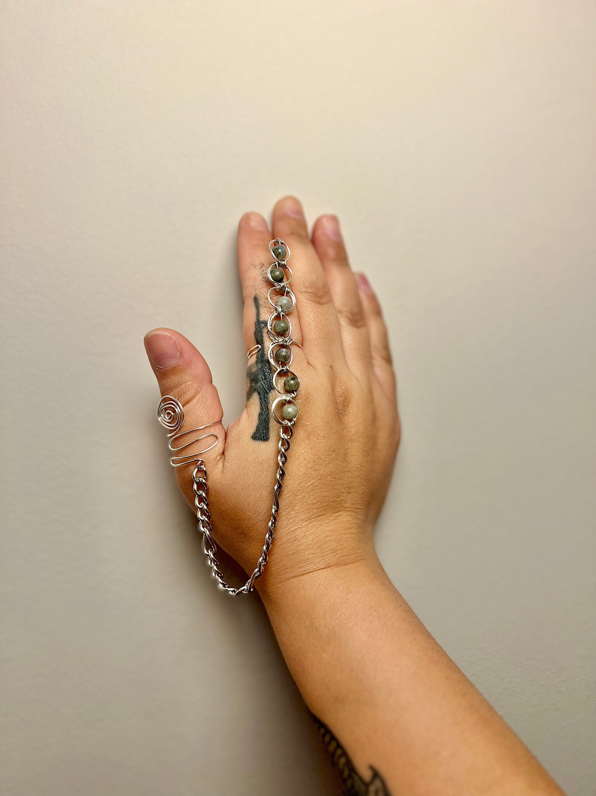Crafted with a mix of silver-plated and stainless steel materials, this piece is designed for both beauty and resilience. Its contemporary-meets-earthy aesthetic makes it the perfect accessory for festival wear, alternative fashion, or anyone drawn to the mystical energy of labradorite. This striking, handcrafted hand chain merges artistic flair with modern durability. A sculptural ring made from silver-plated wire coils elegantly around the finger, creating a bold spiral accent. From the ring, a stainless steel chain flows down the back of the hand, connecting to a vertical line of stunning labradorite stones.