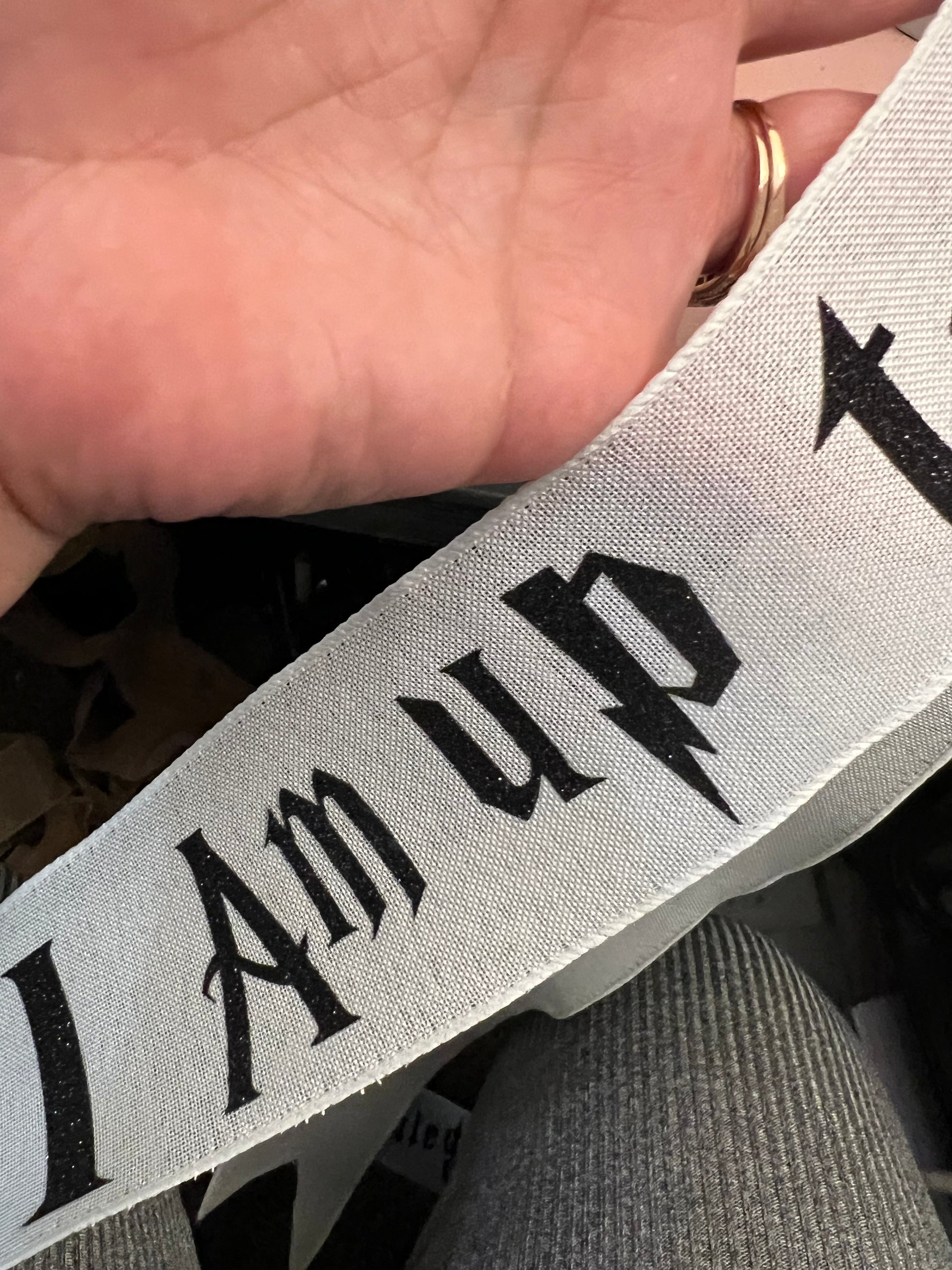 This Ribbon is created with a white/Off White Burlap paired with a glitter black heated vinyl. Each Ribbon is 15 feet long.